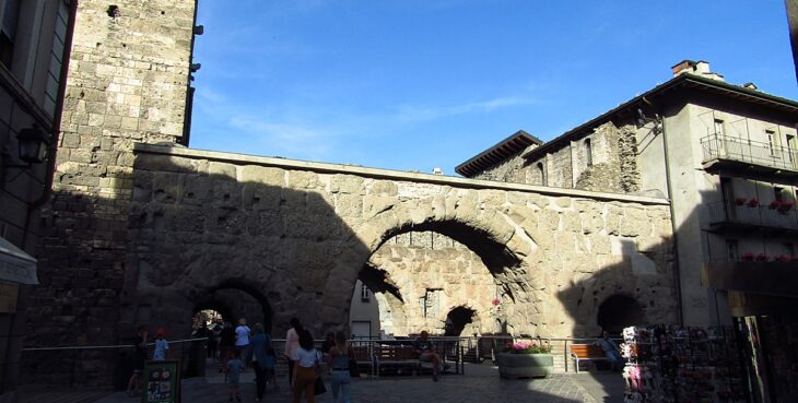 A circa centocinquanta metri a est dell’Arco di Augusto sorge il Ponte Romano, noto anche come Pont de Pierre. Si tratta di un antico ponte, costruito in puddinga – una pietra locale – che un tempo consentiva l’attraversamento del Buthier e l’ingresso nella città romana. Realizzato contestualmente alla fondazione di Augusta Praetoria, il Ponte Romano era fondamentale per garantire il collegamento con le vie transalpine. Infatti, la sua arcata in pietra conserva ancora oggi la compattezza e la robustezza dell’opera originaria. Nonostante ciò, nell’XI secolo un’eccezionale piena deviò il corso del Buthier. Questa circostanza provocò la progressiva perdita di funzione del ponte, al punto che il suo antico alveo col tempo si riempì di detriti. Attorno al 1950, il ponte fu liberato dai detriti e riportato alla luce, restituendo alla città tutta la maestosa bellezza della struttura originale. Attraversarlo a piedi significa perciò camminare su una traccia che collega passato e presente, immaginando i viaggiatori, i mercanti e i soldati che lo percorsero duemila anni fa. Data la sua prossimità all’Arco di Augusto, resta una tappa naturale e imprescindibile per chi vuole muoversi sulle tracce di Aosta romana. Da fare.